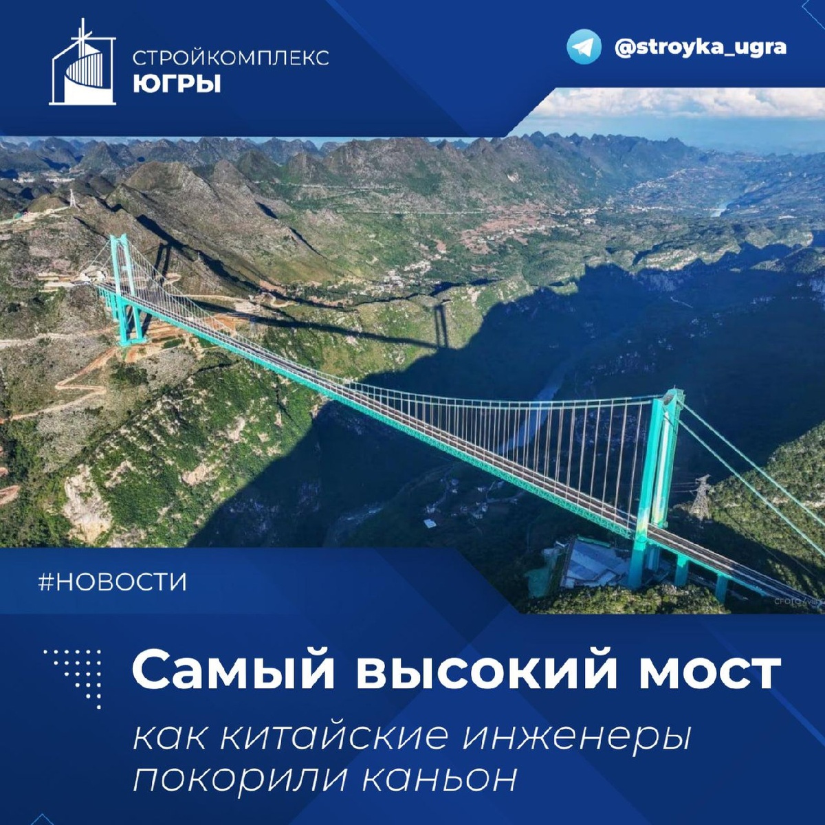 Самый высокий мост в мире: как китайские инженеры покорили каньон Считаные недели остаются до открытия нового моста в районе Сургута, и сегодня в традиционной рубрике #Стройпятница расскажем, как мосты становятся ключевыми драйверами развития больших провинций. 🌉 Недавно в Китае открыли мост, который можно смело назвать новым чудом инженерной мысли. Конструкция парит на высоте 625 метров над рекой — это как два небоскрёба «Лахта-центра», поставленных друг на друга! Цифры, которые впечатляют: 🔵 Высота: 625 м (мировой рекорд!) 🔵 Длина основного пролёта: 1420 м 🔵 Время в пути через ущелье сократилось с 2 часов до 2 минут Строить на такой высоте было настоящим вызовом. Инженеры столкнулись с ветрами до 100 км/ч и сложнейшим рельефом. Чтобы справиться, они применили: ➡️ Умную систему тяги на базе спутниковой навигации — теперь вместо 50 рабочих нужны 1-2 оператора ➡️ Виртуальную сборку — как конструктор в облаках, позволившую собрать 93 сегмента за 73 дня ➡️ Обтекаемую конс