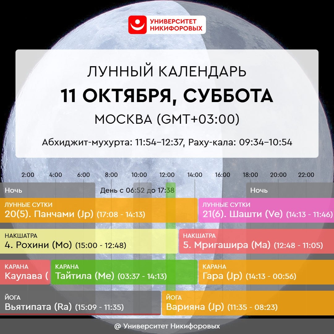 11 ОКТЯБРЯ, СУББОТА До 11:35 энергетика не слишком благоприятная: лучше не планировать на это время ничего значимого. Можно заниматься наведением порядка, повседневными домашними делами. После 11:35 поле вариантов для деятельности расширяется, энергетика становится достаточно благоприятной. Можно заниматься строительными работами, покупками, финансовыми делами. Также энергетика дня хороша для занятия исцеляющими и омолаживающими практиками, общения и обучения. Можно устроить встречу с друзьями в уютном кафе, где можно вдоволь поболтать и насладиться временем вместе, или отправиться на прогулку, совмещая приятное общение с осмотром интересных достопримечательностей. Такая прогулка станет отличным способом узнать что-то новое о городе, открыть для себя скрытые уголки и сделать множество ярких фотографий. А если захочется чего-то более активного, можно организовать небольшой квест или экскурсию. Сегодня лучше не заниматься тяжелой, грубой работой, деятельностью, связанной с разрушени