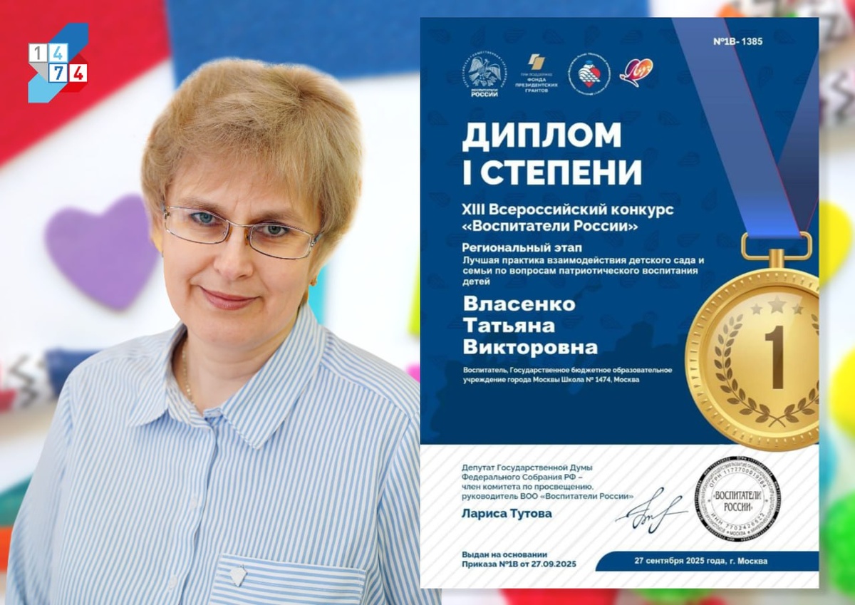 🏆 Поздравляем с заслуженной победой! Педагог дошкольного образования Татьяна Викторовна Власенко стала победителем регионального этапа XIII Всероссийского конкурса «Воспитатели России» 2025! 🥇 Первое место в номинации «Лучшая практика взаимодействия детского сада и семьи по вопросам патриотического воспитания детей» — это заслуженное признание профессионализма и преданности своему делу! От всей души поздравляем Татьяну Викторовну с этой значимой победой! Пусть этот успех станет новым стимулом для творческого вдохновения и новых побед! 👏 #ДОНМ #НашиЛица #Школа1474