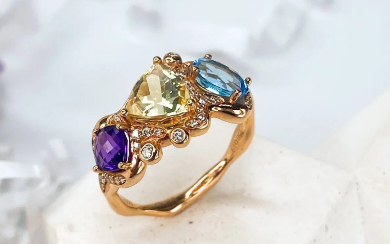 Оно сделано из розового золота 750 пробы. Шинка кольца не прямая, а тонкая и слегка изогнутая, что делает ее интересной. Главный акцент, конечно, сделан на камнях. Это фантастическое трио из трех разных вставок: насыщенно-фиолетового аметиста, яркого солнечного цитрина и небесно-голубого топаза. Остальная поверхность декорирована маленькими сияющими бриллиантами.