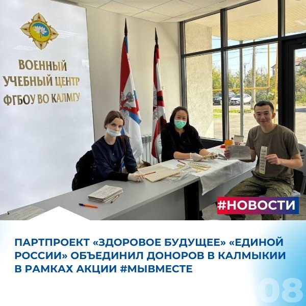 Партия «Единая Россия» в рамках партийного проекта «Здоровое будущее» провела в Калмыкии масштабную донорскую акцию. Мероприятие прошло в стенах Военного учебного центра Калмыцкого государственного университета им. Б.Б. Городовикова и было приурочено к Международному дню врача Акция была организована региональным отделением Партии при поддержке проекта «Правовая помощь СВОим» для участия в Международной премии #МЫВМЕСТЕ. К инициативе активно присоединились команда регионального отделения Ассоциации юристов России по Республике Калмыкия, волонтеры и партнеры. «Партпроект «Здоровое будущее» ставит своей ключевой задачей развитие донорского движения и укрепление общественного здоровья. Сегодня мы видим, как вокруг одного доброго дела сплотились люди, искренне желающие помочь, где бы они ни находились. Это ли не лучшее доказательство нашей общей силы?» – отметили организаторы. В акции приняли участие председатель регионального отделения Ассоциации Анастасия Кравцова, члены Исполнительно