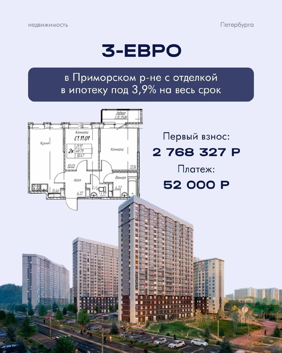 Квартира с отделкой в Приморском районе — ставка 3,9% на весь срок Если ищете вариант с комфортным ежемесячным платёжом в окружении развитой инфраструктурой — обратите внимание на эту евро трехкомнатную квартиру в Приморском районе Петербурга. ↖️ Условия Стоимость квартиры: 13 841 638 ₽ Первый взнос: 2 768 327 ₽ Ежемесячный платёж: 52 000 ₽ Ипотека 3,9% на весь срок Удорожание +10,6% к цене, но ставка фиксирована (стоимость указана с учетом удорожания) *️⃣ Что окружает вашу будущую квартиру: — Развитая инфраструктура: променад, спорткомплекс с бассейном, больницы, поликлиники — Всё для жизни: школы, детские сады, супермаркеты, ТЦ — До КАД — 10 минут на автомобиле — Метро «Беговая» — 20 минут, «Старая Деревня» — 25 минут транспортом Ищите квартиру в Петербурге? Напишите нам в личные сообщения, расскажем, где сейчас самые выгодные условия для покупки.