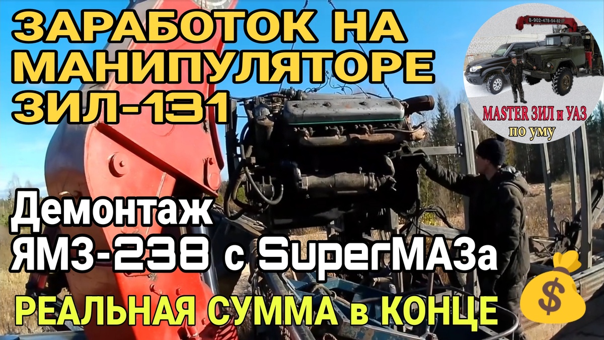 Приветствую всех, кто ищет реальные способы заработка и интересуется работой спецтехники! Сегодня — не теория, а чистый практикум. Я покажу, как обычный выезд на манипуляторе ЗИЛ-131 превращается в деньги. Объект работы — демонтировать огромный двигатель ЯМЗ-238 с лесовоза «СуперМАЗ». В конце, как и обещано, будет честная цифра: сколько платят за такую работу.