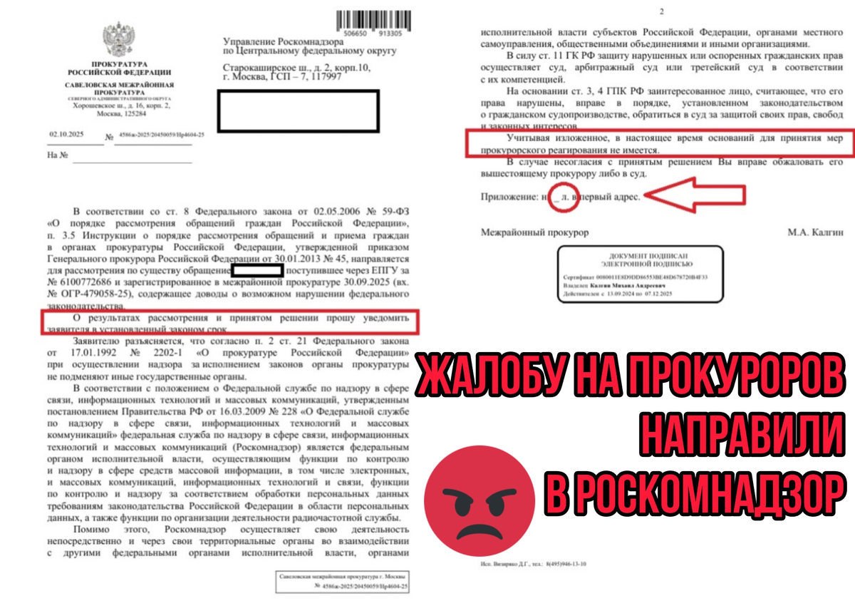 Мое обращение, поданное через ЕПГУ № 6100772686 и зарегистрированное в Савеловской межрайонной прокуратуре 30.09.2025 (вх. № ОГР-479058-25), было незаконно направлено межрайонным прокурором М.А. Калгиным в Управление Роскомнадзора по ЦФО.