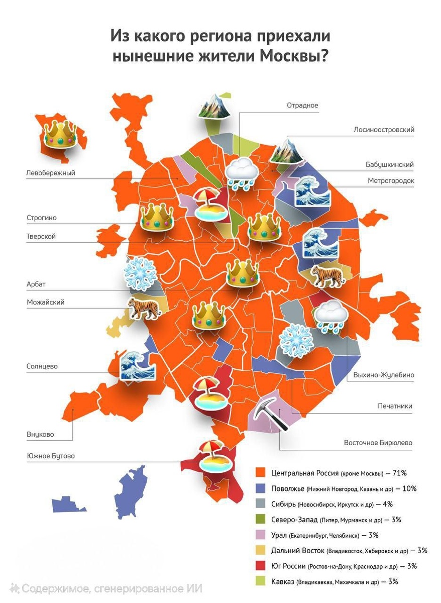 Кто живёт в Москве на самом деле? Москва — это не просто столица. Это место, где встретились люди со всей России. Кто-то здесь родился, кто-то приехал за возможностями — и остался навсегда. Недавний опрос показал, откуда приехали нынешние москвичи👇 • 71% — из соседних, центральных регионов России Многие из них живут в Строгино, Выхино-Жулебино, Внуково — недалеко от родных мест, но ближе к большим возможностям. • 10% — из Поволжья Поволжане прижились в Солнцево и Метрогородке — там, где город чуть спокойнее и уютнее. • 4% — из Сибири Теперь их можно встретить в Кунцево, Лианозово, Люблино. Для них московская зима — почти весна. • 3% — Северо-Запад Петербургская интеллигентность чувствуется в Отрадном, Кузьминках и Западном Дегунино. • 3% — Урал Живут в Бирюлево, Ховрино и Ярославском — спокойные, надёжные, со стальным характером. • 3% — с Дальнего Востока Жители Перово и Новогиреево теперь встречают рассвет уже не первыми, но с той же энергией. • 3% — с Юга России Они выбрали