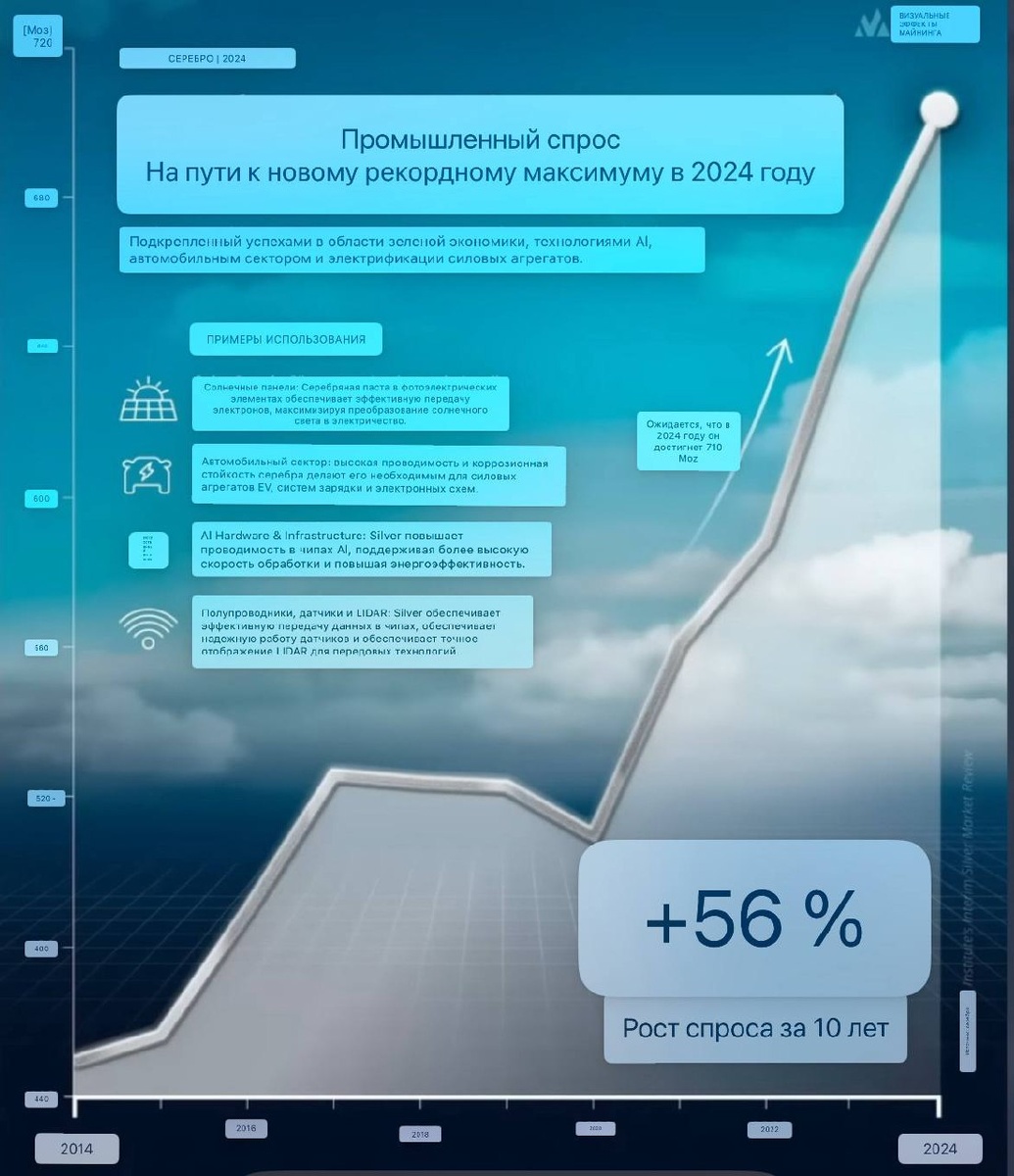 🪙Промышленный спрос серебра вырос на 56% за 10 лет. 710 миллионов унций - на пути к новому рекордному максимуму в 2024 году Подкрепленный успехами в области зеленой экономики, технологиями Al, автомобильным сектором и электрификации силовых агрегатов. Автомобильный сектор: высокая проводимость и коррозионная стойкость серебра делают его необходимым для силовых агрегатов EV, систем зарядки и электронных схем. Al Hardware & Infrastructure: Silver повышает проводимость в чипах Al, поддерживая более высокую скорость обработки и повышая энергоэффективность. Полупроводники, датчики и LIDAR: Silver обеспечивает эффективную передачу данных в чипах, обеспечивает надежную работу датчиков и обеспечивает точное отображение LIDAR для передовых технологий.
