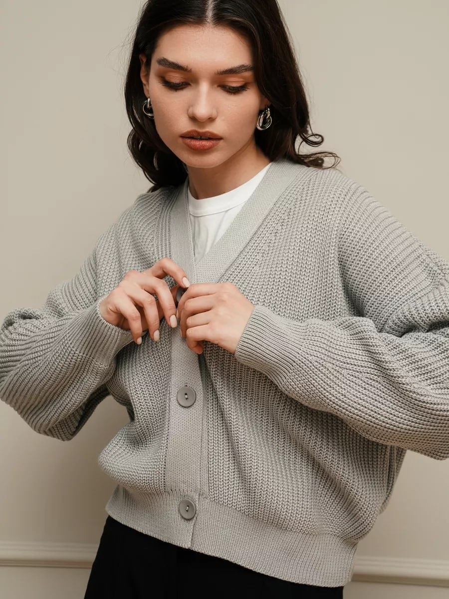 #Осень2025 #Кадиган Кардиган Вязанный укороченный кардиган на пуговицах. Отлично сочетается со всеми предметами гардероба. Классическая модель имеет застежку спереди, V-образный вырез с отсутствием воротника. ✍️ Артикул: 177023751 👌 Размеры: 42 - 46 🔥 Купили более 3,5 т. раз! 👉Кардиган👈 _______ Как тебе❓ ❤️ / 💔 Топовый look с Wildberries 💶💵💴