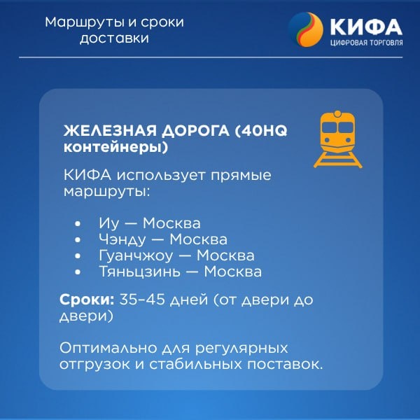 🚚 Из Китая без сюрпризов: маршруты КИФА Делимся деталями логистики КИФА: по каким маршрутам мы доставляем и как выстраиваем процесс. Но важен не только путь, а то, как он организован. 🔵КИФА использует собственные консолидационные склады в Китае, где формируются партии под каждый маршрут. 🔵Документы оформляются заранее, что сокращает время на границе. 🔵Движение отслеживается на всех этапах — от загрузки до прибытия на склад в Москве. Такой подход позволяет нам не просто доставлять, а гарантировать предсказуемость: клиенты заранее знают, когда товар прибудет и по какому маршруту он идёт. 📦 Актуальные направления и сроки — в карточках выше⤴️ ➖➖➖➖ Расскажите нам о вашем товаре — мы подскажем, какой маршрут будет оптимальным по срокам и формату 📩 Оставить заявку