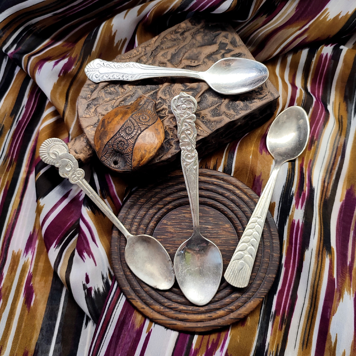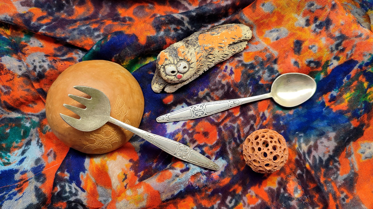 И собрались в этой части ложки южных кровей... Или, вернее, сказать, родившиеся под жарким солнцем ☺️ Алма-Ата, Владикавказ/Орджоникидзе (Северная Осетия), Киев, Вольнянск (Запорожье), Эчмиадзин (Армения) - вот такая география сегодня ложками нарисовалась 🤗 И почему-то мне керамику захотелось сделать темой выпуска. Вот правда же, такая южная атмосфера сразу возникает, стоит поставить на стол кувшин с винoм или блюдо с шашлыком и зеленью 😜 Или миску с варениками, но обязательно глиняную и рядом глечик с молоком 😺 Ну, а я, уж чего нашла, того и наставила на стол! Главное, столовые приборы не забыла положить 😸 И начнет застолье оранжевый кот. Который живет в казахской юрте 😼 Ну, юрта та условная, а ложка с вилкой Алма-Атинские. В момент первой презентации вилки разгорелись споры, для чего она. Я, например, впервые узнала о шпротных вилках - коротких и широких. Но по классике еще должна быть перемычка на зубцах. А это - десертная вилка из набора, где шесть чайных ложек и одна такая в