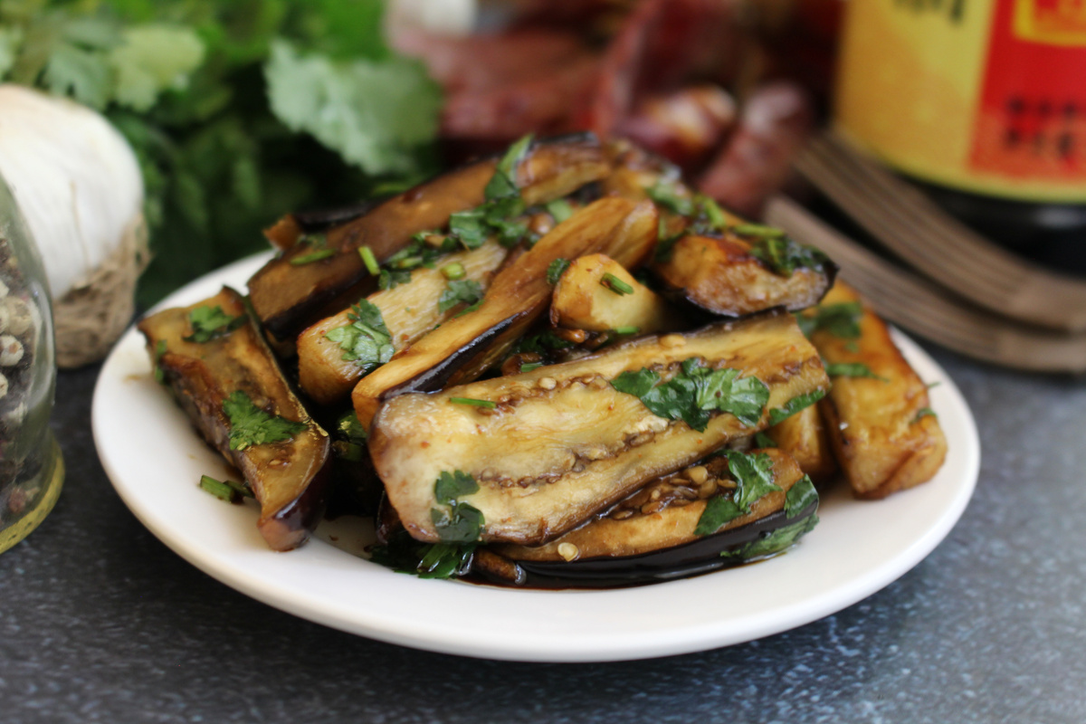 Закуска или салат из запеченных баклажанов, блюдо, которое сразу можно подать к столу, а можно дать ему немного настояться перед подачей. Закуска легкая, вкусная, сочная, остренькая, хотя острый перец можно и не добавлять, это по желанию. Кинзу тут заменить не получится, аромат именно этой зелени добавляет блюду вкус, насыщенность, душистость. Количество чеснока и зелени можно увеличить. Эта закуска хороша тем, что баклажаны не обжариваются, а поэтому не впитывают много масла. Чем дольше стоит закуска, тем вкуснее она становится. Если вы любите блюда из баклажанов, то и такой рецепт можно опробовать. Баклажаны - 1 кг. Чеснок - 7-8 зуб. Кинза - 1 пучок Перец чили молотый - 0.5 ч.л. Соевый соус - 50 мл. Масло растительное - 50 мл. Уксус яблочный - 2 ст.л. Сахар - 0.3 ч.л. Соль - по вкусу Баклажаны промоем, почистим полосками, часть шкурки оставляем. Нарежем баклажаны толстыми и крупными брусочками, добавим половину масла и перемешиваем. Выложим баклажаны на противень и отправим в разогре