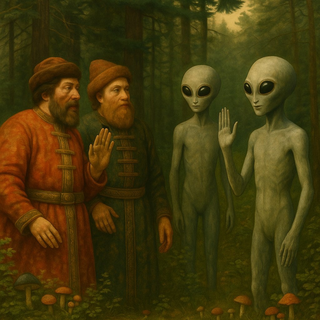 Однажды утром два брата, Михаил и Алексей Бояркины, отправились в лес за грибами. Лес был густым и таинственным, но братья знали здесь каждый уголок. Они шли, весело напевая народные песни и шутливо переговариваясь друг с другом.— Смотри-ка, Мишенька, вон там белый гриб виднеется! — воскликнул Алексей, показывая рукой вперед.— Ага, братец, дай-ка проверим! — ответил Михаил, ускоряя шаг.Но вдруг оба остановились как вкопанные. Прямо перед ними стоял небольшой космический корабль серебристого цвета, сверкавший в лучах утреннего солнца. Из корабля вышли двое существ странного вида: высокие, стройные, с большими глазами и светящимися антеннами на головах.— Приветствуем вас, жители Земли! Мы прибыли с планеты Нибиру, чтобы установить контакт с вашим видом, — произнесли существа одновременно, издавая мелодичные звуки.Михаил и Алексей переглянулись, широко раскрыв глаза.— Ух ты, гляньте-ка, гости-то знатные пожаловали! — прошептал Михаил, слегка улыбаясь.Алексей, будучи человеком смелым и общ