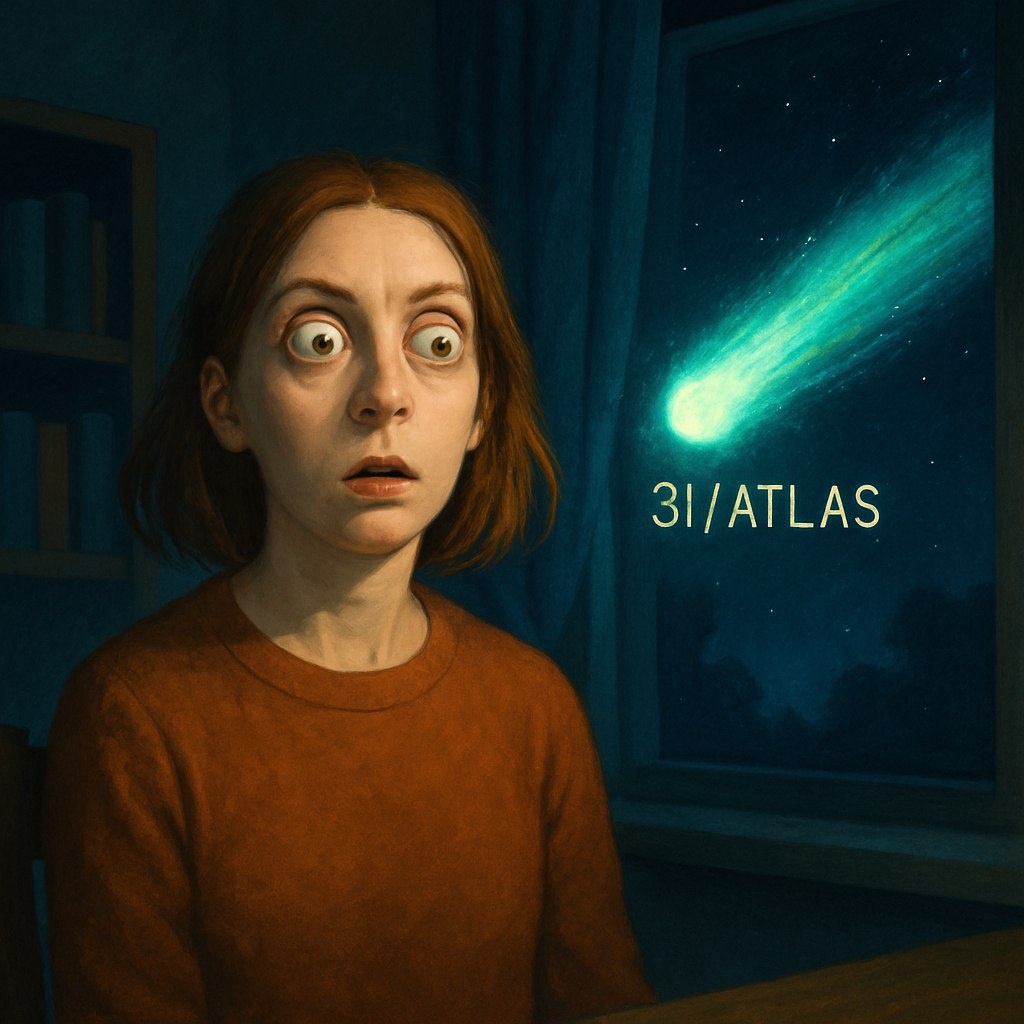 Наташа была увлечённой астрономией девушкой, жившей в маленьком городке неподалёку от леса. Она обожала наблюдать ночное небо и мечтала однажды увидеть настоящую комету своими глазами. Однажды вечером, сидя возле телескопа, Наташа заметила необычное свечение далеко на горизонте. Сначала она подумала, что это просто отражение городских огней, но вскоре поняла, что наблюдаемое ею небесное тело было именно той самой загадочной кометой, которую она давно искала.Комета имела название 3I Atlas, и её появление стало настоящим событием для местных жителей. Все знали, что эта комета появляется крайне редко, и видеть её – настоящая удача. Наташа решила посвятить себя изучению этого явления и начала записывать наблюдения каждую ночь.Через некоторое время Наташе начало казаться, что она ощущает связь с кометой. Иногда ей казалось, будто она слышит тихий шёпот среди звёзд, словно сама комета пыталась связаться с ней. Эти ощущения были настолько сильными, что девушка решила поделиться ими с друзьями
