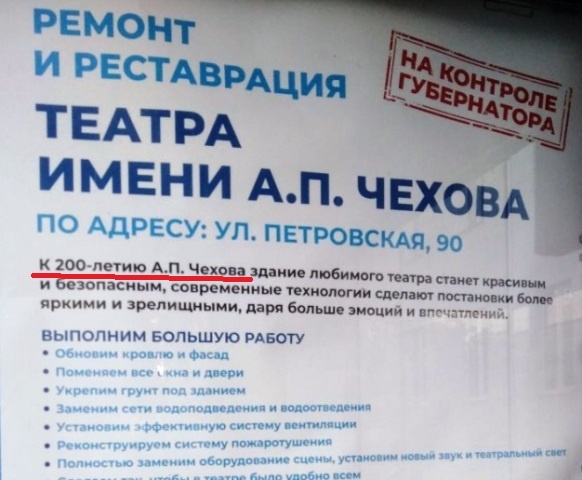 Внимательные таганрожцы заметили, что на баннере, размещенном на здании Чеховского театра, где сейчас идет реконструкция, неверно обозначена дата юбилея А.П. Чехова. На баннере указано, что ремонт театра завершится в 2027 году, «к 200-летию А.П. Чехова». На самом деле 200 лет нашему великому земляку исполнится в 2060 году. В администрации города, куда мы обратились за разъяснениями, ответили, что во время вёрстки макета баннера произошла техническая ошибка. Завершение ремонта запланировано, действительно, на 2027 год – к 200-летию театра, а не писателя, чье имя он носит. Фото на главной: donland.ru