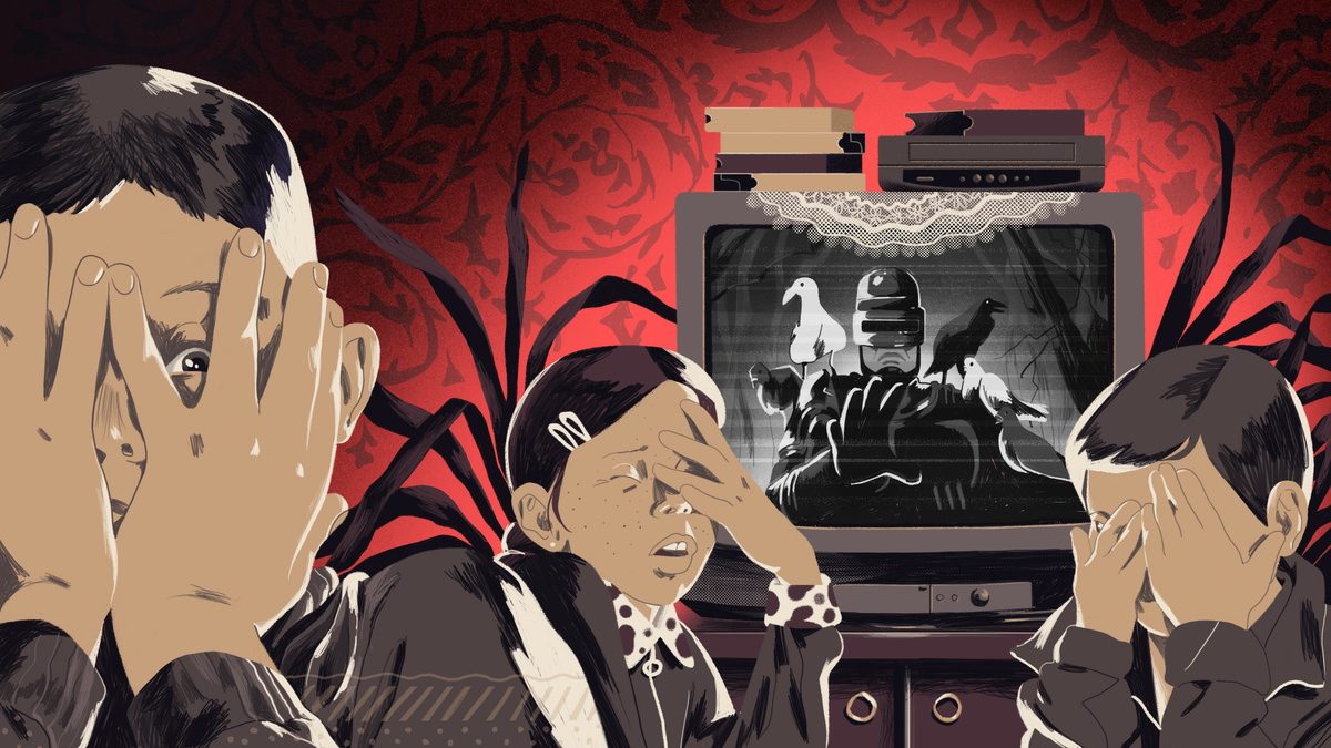 Одно из отчетливых детских воспоминаний, связанных со страхом, — то, что он оказывался двойственным. Безопасным, когда с разрешения родителей записываешь новые серии «Боишься ли ты темноты?» на видеомагнитофон, а потом пересматриваешь ради атмосферы снова и снова. Но еще был страх подлинный, хтонический, он не шутил, столкнуться с ним можно было разве что случайно. Например, проходя мимо неплотно закрытой двери, увидеть в щелку кадр из «Вия» или заставку телекомпании «ВИD», а потом долго лежать в темноте с открытыми глазами, раздумывая, что это было.
