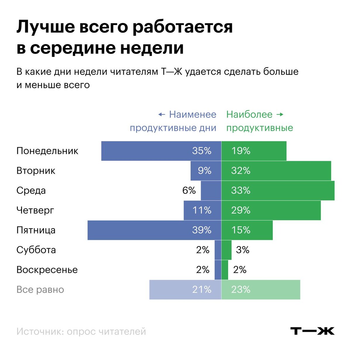 Мы написали этот пост еще в среду утром, а выложить руки дошли только вечером в пятницу. Неудивительно: ведь сммщик мужчина, и ему еще нет 40 лет. Какая тут вообще связь? А вы сами посмотрите статистику: https://t-j.ru/tg/opros-pro-nedelechku-rez/
