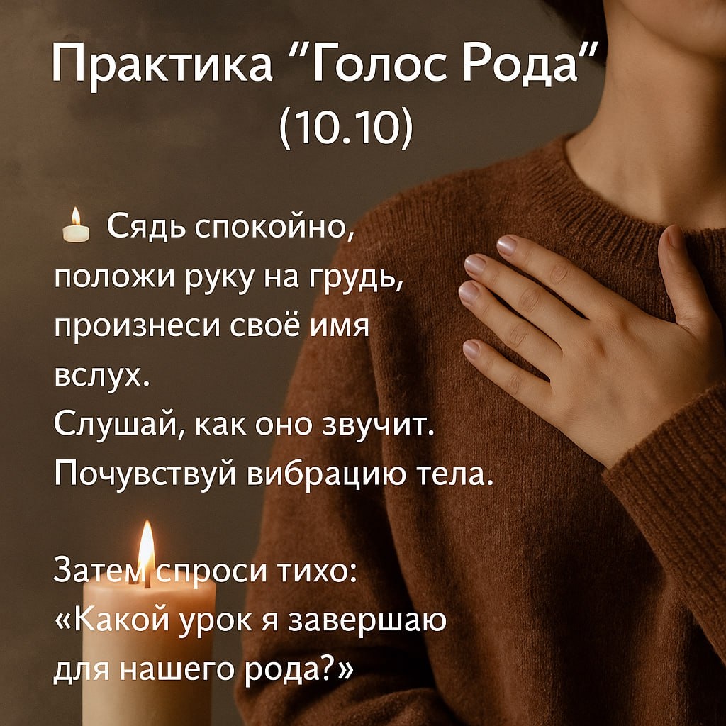 Практика “Голос Рода” (10.10) Сядь спокойно, положи руку на грудь, произнеси своё имя вслух. Слушай, как оно звучит. Почувствуй вибрацию тела. Затем спроси тихо: “Какой урок я завершаю для нашего рода?” Ответ придёт не умом, а ощущением, образом, дыханием. Так начинается диалог с Родом. ✨ Сегодня всё пространство помогает услышать ответы. Просто будьте внимательны. Мир говорит с вами через имена, знаки и числа. Светлана Болотова|Проводник в изобилие