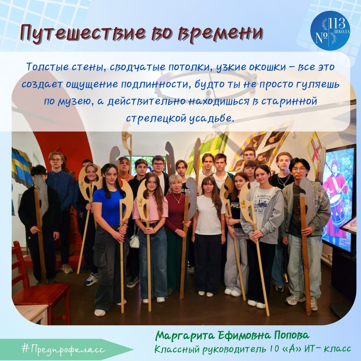⌛️ Путешествие во времени. 🗓9 октября 10 «А» ИТ- класс вместе с классным руководителем Поповой Маргаритой Ефимовной и советником директора Наталией Борисовной Нигматуллиной посетил интерактивную экскурсию в МуZей Московских стрельцов «Стрелецкие палаты» - «Хитрости ратного дела». 🌉 Для ребят это была не только историческая экскурсия с погружением в прошлое , но и мостик , связывающий прошлые столетия с современными событиями. Посещение музея – это погружение в эпоху стрелецкого войска. 💪 Атмосфера мощи и надежности. Экспозиция рассказывает о быте, вооружении и участии стрельцов в исторических событиях. Особенно интересны предметы вооружения, демонстрирующие силу войска. Музей уделяет внимание стрелецким бунтам и их трагическим последствиям. Узнаешь о причинах недовольства, требованиях и подавлении восстаний. Экспозиция представляет и бытовую жизнь людей того времени, их ремесла и обычаи. 👍Посещение Стрелецких палат позволяет увидеть историю глазами стрельцов, почувствовать связ