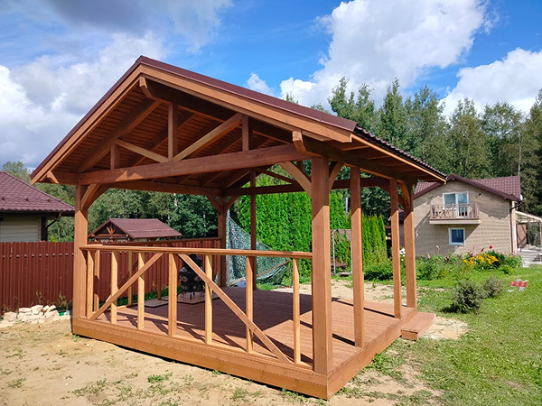 Вся древесина навеса обрабатывается гибридным лессирующим антисептиком Акватекс Викингв два слоя. Покрытие защищает от влаги, ультрафиолета, грибка и синевы, при этом сохраняет естественную текстуру дерева. Цвет подбирается по палитре Valtti, что позволяет вписать навес в любой ландшафт.
