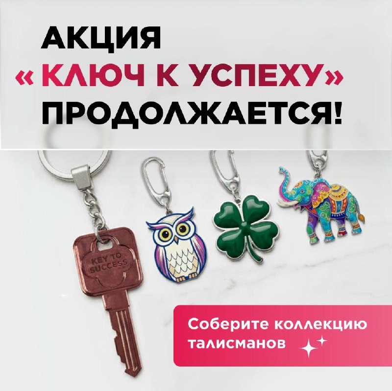 🎉 Продолжение акции для всех, кто уже получил свой ключ к успеху: «Ключ к успеху. Талисманы»! ➡️ Вас ждут красивые талисманы-подвески на ключ, которые будут вас поддерживать и напоминать о наших общих больших целях! 🟡 Четырёхлистный клевер - здоровье, богатство, уважение окружающих и любовь; 🟡 Мудрая сова - богатство, мудрость, удача; 🟡 Слон удачи и процветания - долголетие и спокойствие. Как собрать коллекцию талисманов? Начиная с периода 16/25: 1️⃣ 8 периодов подряд выполняйте 30 баллов здоровья в ЛО и получите в подарок подвеску «Четырехлистный клевер». 2️⃣ После получения подвески «Четырехлистный клевер» следующие 8 периодов подряд также выполняйте 30 баллов здоровья в ЛО и получите в подарок подвеску «Мудрая сова»! 3️⃣ После получения подвески «Мудрая сова» следующие 8 периодов подряд выполняйте 30 баллов здоровья в ЛО и получите в подарок подвеску «Слон удачи и процветания»! ❗️ Если в одном из периодов вы не выполнили от 30 баллов здоровья, вы можете продолжить участи