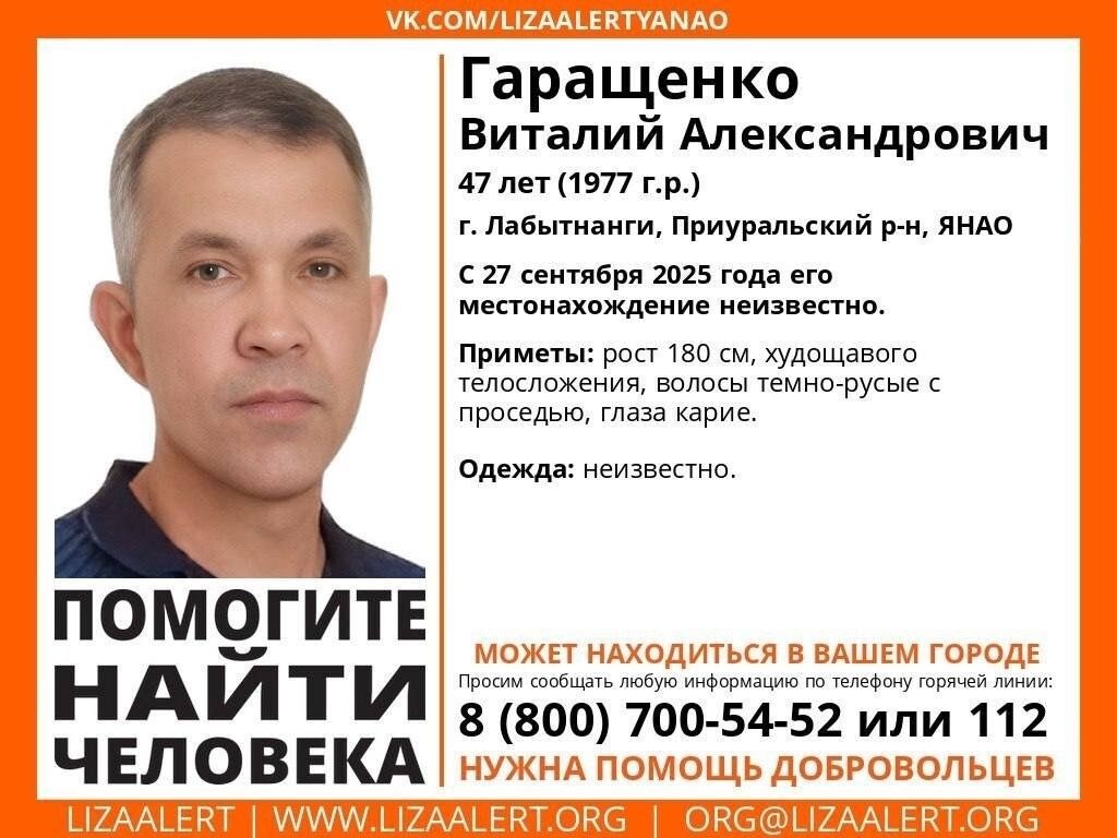 ❗В Лабытнанги пропал Виталий Александрович Гаращенко С 27 сентября местонахождение 48-летнего мужчины неизвестно. Любую информацию можно сообщить по телефонам: 8 800 700‑54‑52 или 112.