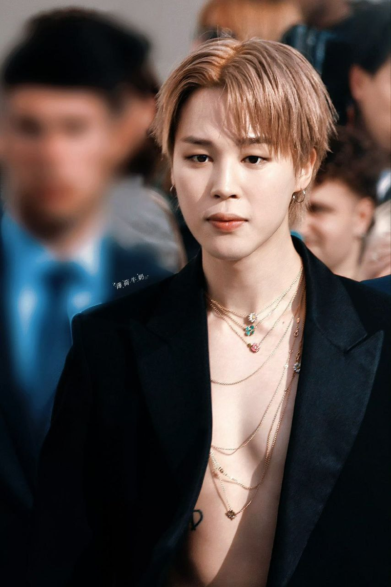 Вот что они пишут о Чимине: «Чимин, впервые появившийся на показе Dior после завершения военной службы, поразил публику смелым образом — он надел пиджак на голое тело. Сочетание сияющих светлых волос и фарфоровой кожи придало ему невероятную сияющую ауру и божественное сияние».