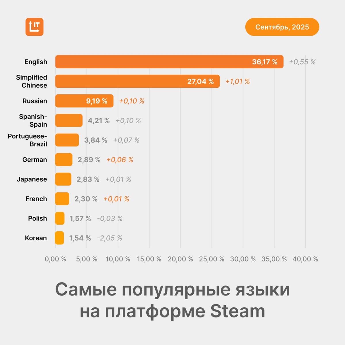 📣 САМЫЕ ПОПУЛЯРНЫЕ ЯЗЫКИ НА ПЛАТФОРМЕ STEAM В 2025 ГОДУ ✏️ Мы подготовили свежую статистику самых популярных языков на платформе Steam на основе данных за сентябрь 2025 года. 📌 Подробности по ссылке