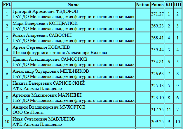 Прежде чем перейти к лидерам, несколько слов о тех, кто оказался ниже в турнирной таблице. Егора Рухина (192.88 - 13 место), Максима Автушенко (195.45 - 12 место), Кирилла Кропылева (198.16 - 11 место) турнир застал в процессе еще только набора спортивной формы, которой здесь и сейчас не хватило даже для 200 баллов. Можно было бы предположить, что Егора наша Федерация все-таки наградит за прошлогодние успехи (прошел отбор на Чемпионат России) хотя-бы одним этапом Гран-при, но уж слишком слабо он выглядит на старте сезона, поэтому скорее всего останется без Гран-при.