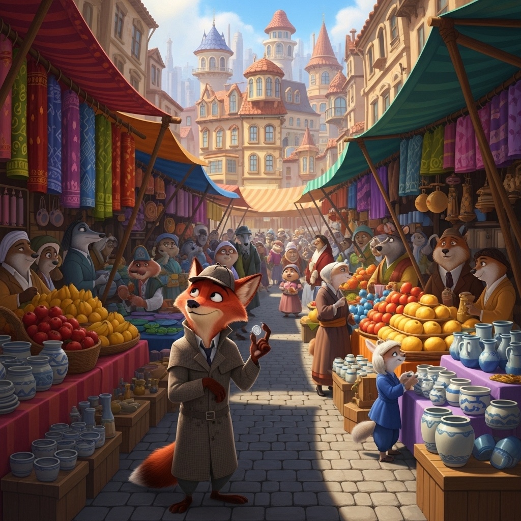 Серебряный Бор — это не просто город. Для нас, лесных жителей Рыжухино, это шумный, блестящий и немного пугающий центр вселенной. Здесь дома в несколько этажей, тротуары вымощены гладким камнем, а по главной улице даже ездит дилижанс! Воздух пахнет не хвоей и мёдом, а свежей выпечкой, углём из кузницы и десятками разных зверей. Я бывал тут редко, и каждая поездка была событием.