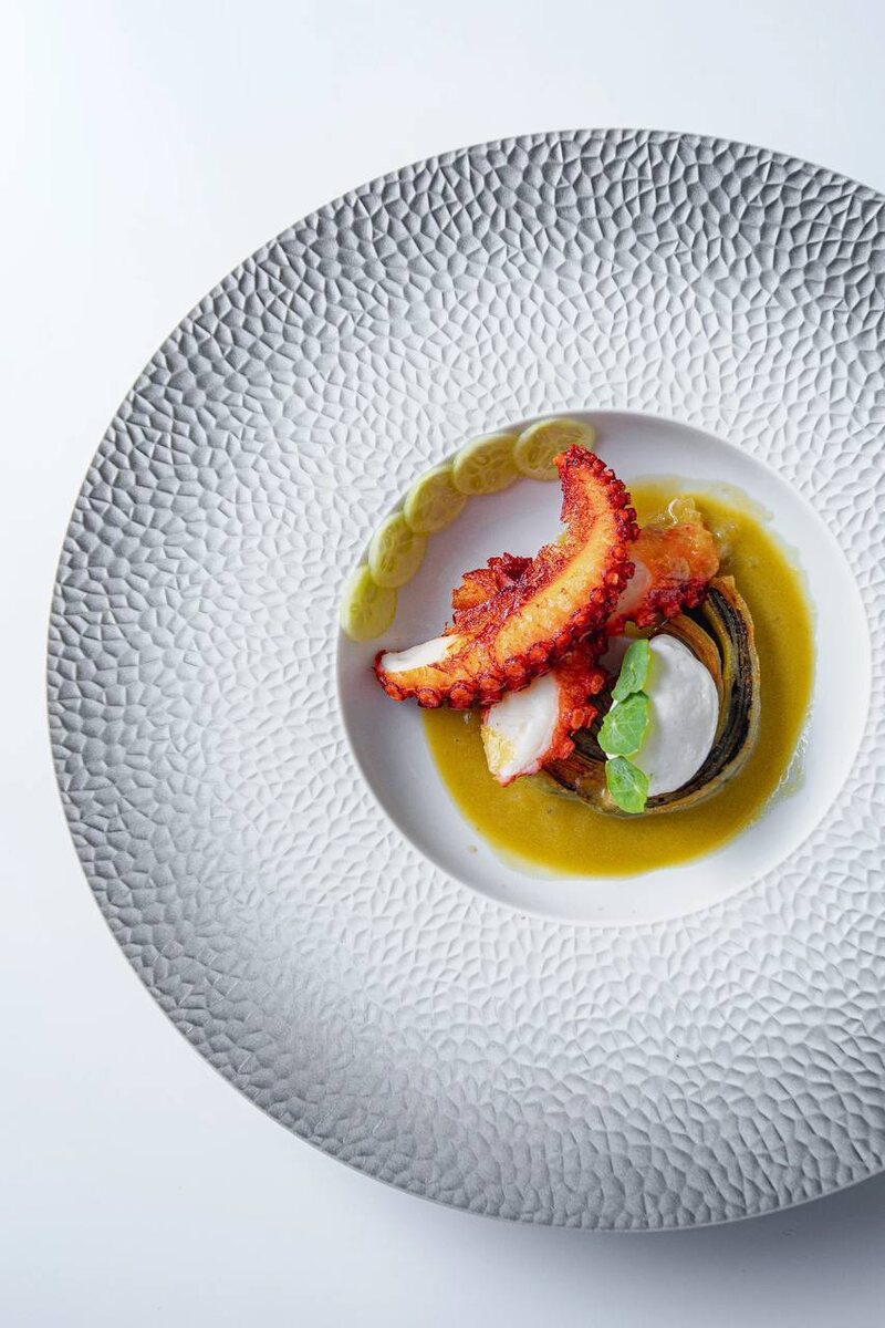 Диалог культур в одной тарелке. Россия встречается с Японией 🇷🇺🤝🇯🇵 Шеф Twins Garden Виталий Савельев создал настоящий гастрономический мост. С одной стороны — знакомые вкусы: Картофельный чипс, нежный мусс из сметаны, томатный соус. Узнаёте? Это уютное русское гостеприимство. С другой — дерзкие акценты: Идеально приготовленный осьминог и тёртый корень васаби. Это элегантная японская точность. Конечно, главный герой — осьминог: Готовим его под давлением, чтобы сохранить всю сочность, а потом на 15 секунд — во фритюр, для идеальной хрустящей оболочки. Попробуйте, как два мира гармонично встречаются в одном блюде. ✨ Блюдо представлено в дегустационном сете.