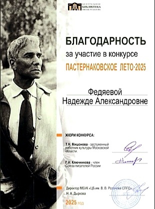 Получила благодарность за участие в конкурсе и за талантливые произведения, созданные в рамках конкурса "Пастернаковское лето 2025". Было интересно впервые поучаствовать в нём, и, надеюсь, что он станет важным этапом моего творческого пути. На конкурс поступило 637 заявок со всех уголков нашей необъятной России: Сергиев Посад, Москва, Санкт-Петербург, Самарская, Воронежская, Нижегородская, Курганская, Свердловская, Калининградская, Тверская области, Хабаровский край, республика Коми, Крым, ДНР, ЛНР, Краснодарский край и другие. Хочу только добавить, что Борис Пастернак был и остаётся одним из моих любимых поэтов! 😊 #пастернаковскоелето2025 #хочуподелиться #поэт #поэзия #пастернак #uckuccmbo #artisty #artisty_official