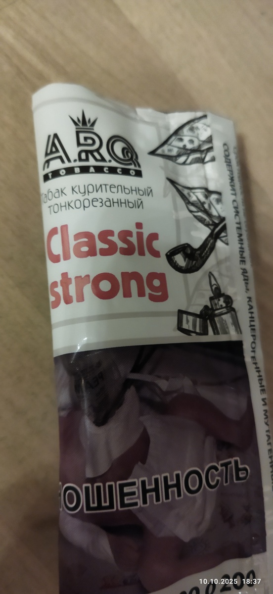 Доброго времени суток, уважаемые читатели канала! И снова с вами я. Сегодня я созрел-таки до кисета табака присланного мне одним из читателей канала в качестве презента. Тогда он прислал, кроме этого кисета, пачку мини-сигареток из Японии марки "HOPE" и еще пачку всяких разных японских сигарет в ассортименте. В общем, сегодня кисет... Strong - "Сильный", "Крепкий" (с английского языка). "Классик" - вы сами понимаете что это... Получается "классический крепкий табак". И - да, открыв кисет почувствовал брутальную крепость духа. Не сладкими булочками и кондитерской сдобой а именно серьезным табачком - таким "боцманским". Произведен он в России, в Московской области (город Московский, поселок Московский). Выпускается с 2022 года. Вышло их сразу 6 позиций, 4 с ароматизаторами и 2 классические (хотя в составе и указано что применены пищевые ароматизаторы) - я их не почувствовал совсем, по крайней мере при курении. Но из кисета пахнет чем-то тонким, не совсем табачным, где-то "на задворках",