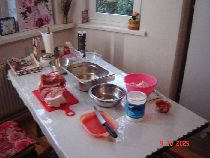 Начали делать колбасу где- то год назад, учились, как всегда, по интернету. Пересмотрели, запомнили кучу роликов, исписали несколько листов бумаги. По началу придерживались рецептуры, но постепенно стали импровизировать. И, как обычно, сначала учимся по интернету, а потом начинает учить собственный опыт, этот рецепт уже получился сам собой, и, по -оему он самый простой. Свинина подойдет почти любая, дополнительно добавляем сало. Кость вырезали на суп, кожу обрезали. Вес мяса без кости и шкуры 3 кг 100гр., и сала около 400гр. Разделываем мясо на чистое филе и на остальное со всеми пленками и прослойками. Турецким ножом " Сатыр" измельчаем филе. Случайно увидел его в интернете, нож очень удобен для измельчения мяса при приготовлении не только колбасы, а также домашней шаурмы, рубленых котлет, бифштексов. Остальное мясо и сало перекручиваем на мясорубке со средней решеткой. Рубленное мясо смешиваем с фаршем. Засыпаем посолочную смесь, нитритная соль наполовину с поваренной. Соль рассчитыв