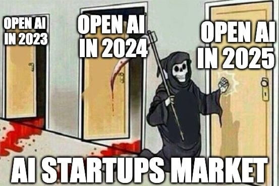 Еще один мем, который ходит по западным соц.сетям. С каждый релизом openAI где-то тихонько тухнут ИИ- стартапы. Эти гиганты как черные дыры - засосут в себя что угодно, лишь бы удержать пользователя в свой эко-системе. Но они не любят ручной труд, работу с клиентом тет-а-тет и именно тут скрыты мелкие возможности для нищих стартапов вроде нас :) Русский ИТ бизнес