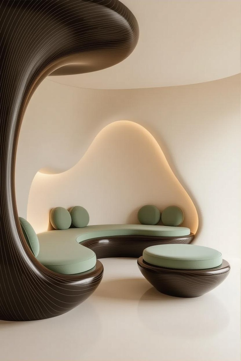 Параметрические интерьеры... они как будто не подчиняются законам привычного мира. Границы восприятия растворяются: где пол, где стена — уже не понять. Мебель будто выросла из пространства, а потолок — просто продолжение линии, которая не захотела останавливаться. В этом есть что-то цепляющее, потому что интерьер слишком свободный, а где-то и дерзкий. Когда линии слушают человека Мы слишком привыкли к прямым углам. К тем самым “чтобы всё ровно, по уровню”. А тело — оно ведь двигается иначе. Не по линейке. Мы идём по дуге, обходим, отклоняемся. Поэтому мягкие, текучие формы кажутся нам естественнее, ближе. Они разговаривают с телом на одном языке. Наш мозг устает от прямолинейности — она ассоциируется с контролем, рамками, задачами. А когда взгляд скользит по изгибу, появляется эффект покоя.