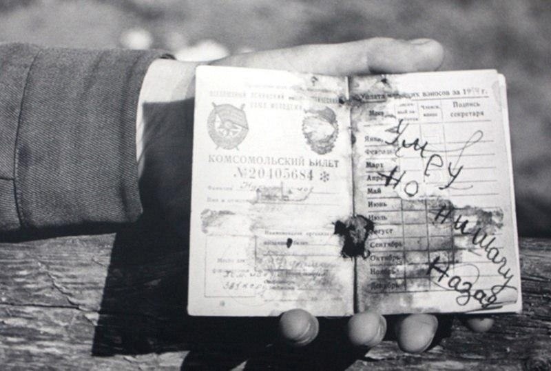 Комсомольский билет погибшего красноармейца казаха Нурмаханова под №20405684 с записью на страницах «Умру но ни шагу назад