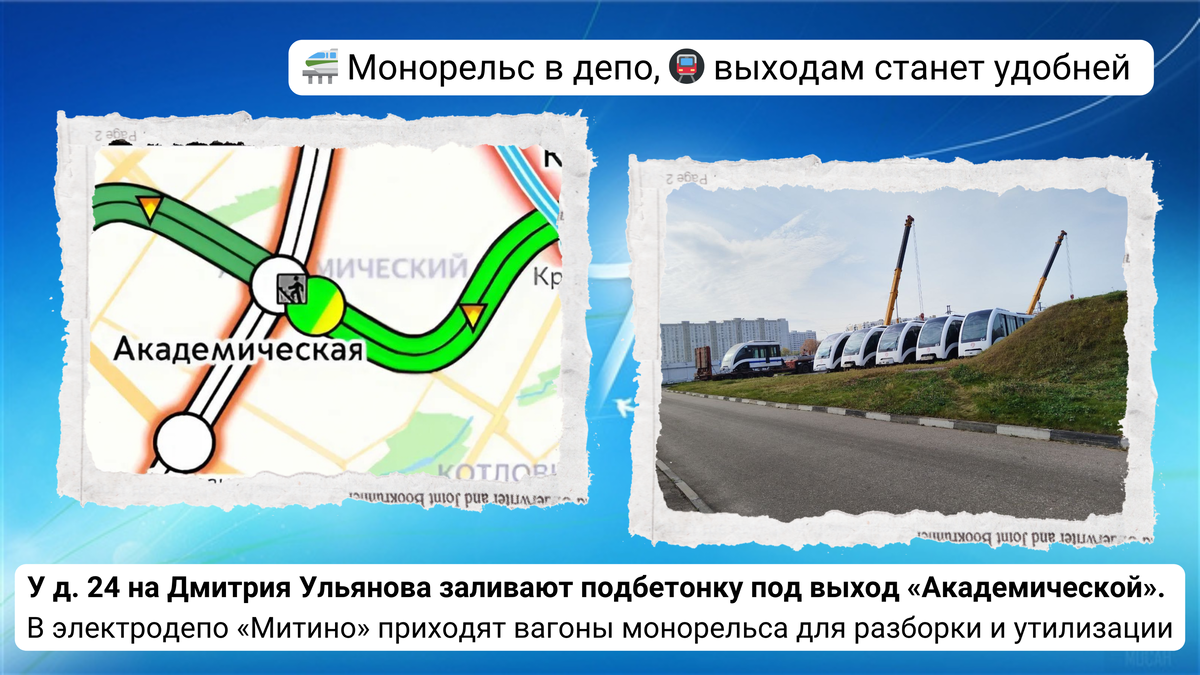 официальные отчеты. Давайте вместе разберемся, что же на самом деле происходит с нашей Москвой. Поехали? В котловане строительства выхода в город у д. 24 по ул. Дмитрия Ульянова 🚇 «Академическая» 🏡Троицкой линии ведутся работы по устройству подбетонки – основания под основные конструкции схода. Мы продолжаем наблюдать за ходом поступления в 🚉 электродепо «Митино» вагонов московского монорельса для последующей утилизации. ----------------------------------------------------------------------------------- Ну в