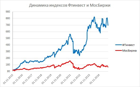 ❕За прошедшую торговую неделю наш российский портфель потерял 0,92% до уровня 773,11, за этот же период времени индекс МосБиржи упал на 0,61% до 2588,56 пунктов, , таким образом альфа нашего портфеля с 1 ноября 2015 составляет 625,56%, а с 1 января 2025 (-1,2% (индекс ФТинвест) – -10,13% (индекс МосБиржи)) = 8,93%.