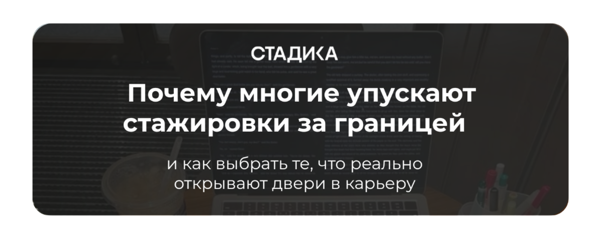 🔗 Подробнее 🌟 Наши стажировки «под ключ» Но вот в чём подвох: даже зная про стажировки, легко потеряться в документах, требованиях и визах. Именно поэтому мы в Стадике сделали сервис стажировок под ключ: На нашем сайте прямо сейчас можно найти возможность для себя и заполнить заявку на беспла