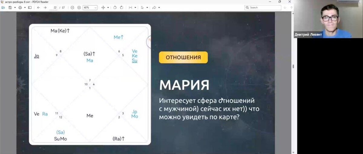 «Боюсь прожить жизнь впустую, не реализовав свой потенциал» «Хочу понять миссию, с которой пришла в этот мир» «Много лет в разводе и без отношений - будут ли они у меня еще?» «Отношения заходят в тупик, как быть?» «Как найти то дело, от которого и глаза горят, и финансы приходят хорошие, чтобы чувствовать себя на своем месте!?» ЭТО ОДНИ ИЗ ЗАПРОСОВ, КОТОРЫЕ МЫ РАССМАТРИВАЛИ В ЗУМЕ НА АСТРО-РАЗБОРАХ 🔥 Что мы делали в прямом эфире: 1 – Я открывал карту человека и его запрос, на примере этой карты и этого запроса, я рассказывал участникам, как делать анализ своей карты 2 – В ходе анализа по карте выбранных людей я отвечал на их запросы А в это время каждый из участников зума смотрел свою карту и забирал инсайты из нее! 3 – После анализа я выдал рекомендации конкретному владельцу карты и отдельно – остальным зрителям разборов (у них ведь другие положения в натальных картах!) 🌟 Итог: каждый получил персональные астрологические рекомендации по определению своего предназначения,