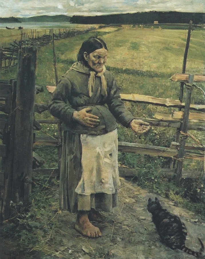 В последнее время мне часто на глаза попадалась одна картина финского живописца Галлен-Каллела под названием "Старуха и кошка".