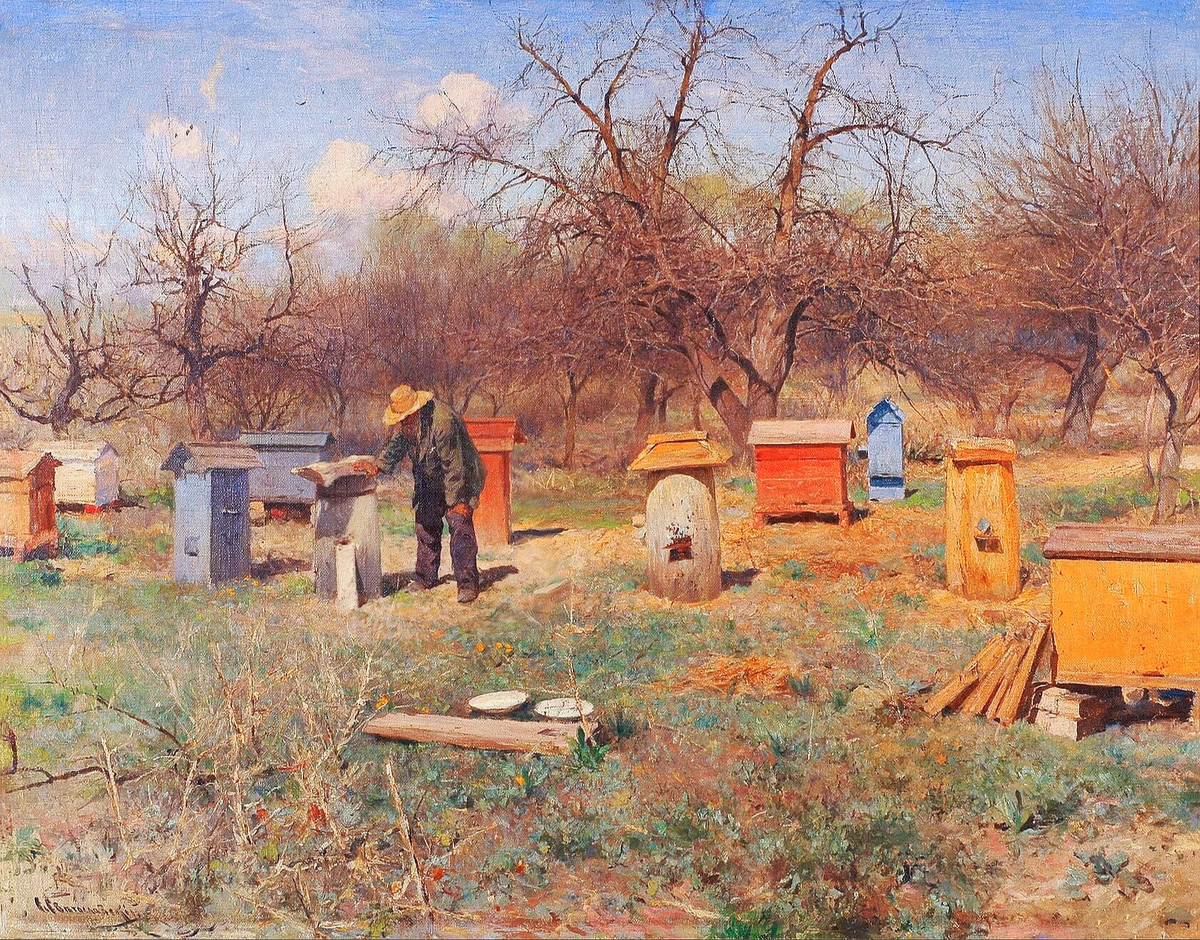 Сегодня познакомлю Вас с работами художника Сергей Ивановича Светославского, жившего в период 1857 - 1931 годов. Большая часть его творчества посвящена дореволюционной России (или Российской империи), так как, начиная с 1920-х годов из-за обострения болезни глаз он практически не работал как живописец. Художник родился в Киеве 1 (13) декабря 1857 года. Его жизнь была связана с Москвой и Киевом. Так в Москве он проживал в 1870-1883, 1890-1894 годах, остальное время в Киеве. Художественное образование Светославский получил в Московском училище живописи, ваяния и зодчества, где учился у Алексея Саврасова, Василия Перова, Евграфа Сорокина, Иллариона Прянишникова, Василия Поленова. В период 1891-1900 годов был членом Товарищества передвижников. В 1905-1907 годах он организовал художественную студию, где свое образование продолжили бывшие студенты Киевского художественного училища, исключенные за участие в студенческих волнениях. 1. "Весенний день. Пасека", 1899 год. 2. "Начало весны", 1895