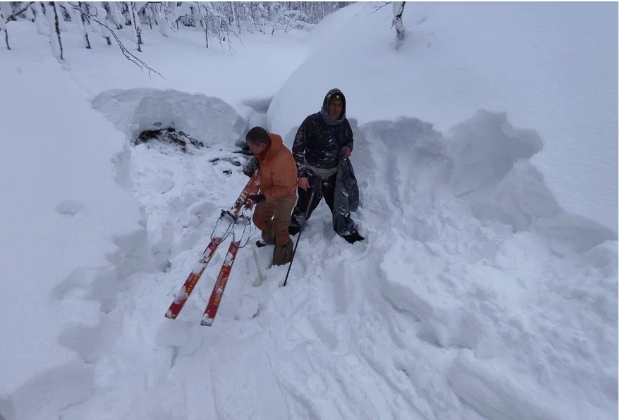 Участники экспедиции 25-го года в самые первые дни февраля. Раскопки русла ручья. Снега много, но ложбина русла ручья видна хорошо. В 59-ом году его было гораздо меньше, судя по настилу, который был от земли выше на 30 сантиметров. На данной фотографии он был правее ручья. Конечно, надо учесть, что под настилом снег был утоптан. Но и здесь над ручьём всего-ничего. Надувает снег со временем с западной стороны –на фото справа высокий его надув. Через месяц затянет весь овраг. Так что главный вопрос: – Откуда мог обрушиться снег на туристов 59-го года? – очевиден – негде ему было взяться.