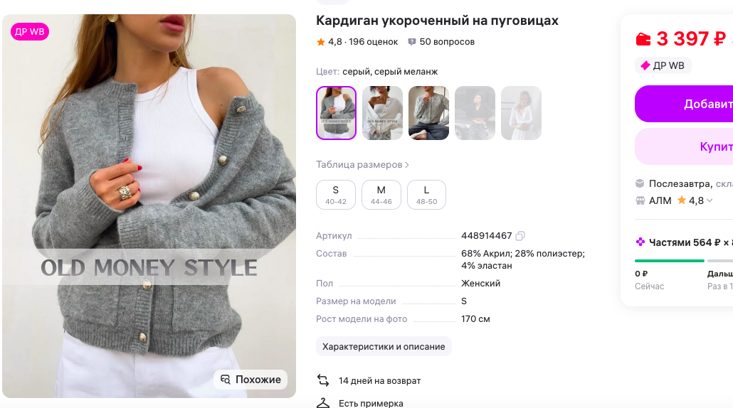 В составе — почти половина настоящего кашемира (48%!), а дальше — шерсть, хлопок, немного эластана для эластичности и мягкой посадки. Такая вещь буквально окутывает теплом. Надел — и почувствовал, как будто кто-то аккуратно укутал тебя пледом. Причём плед этот, знаешь, не просто для дома, а для самого уютного вечера в стильной французской кофейне.
