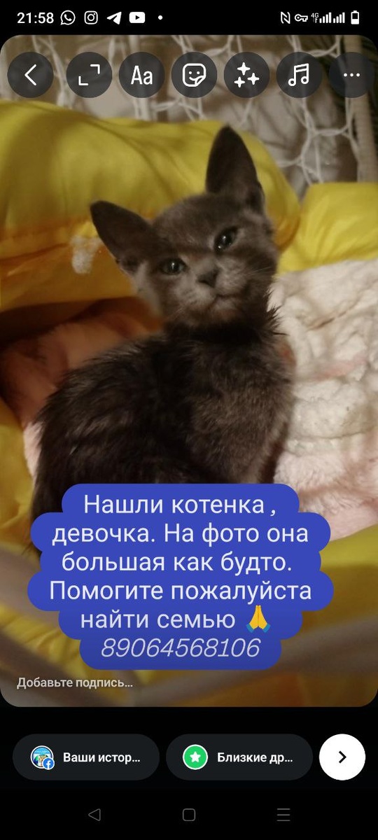 Нашли котенка , девочка. На фото она большая как будто. 89064568106
