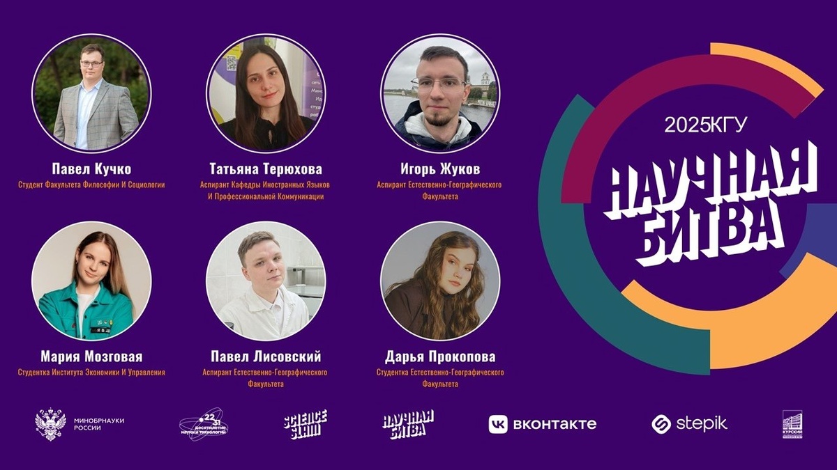6 молодых ученых 10 минут на выступление 1 победитель 🗒11 октября в 10:00 📍Точка кипения КГУ (Радищева 29, 5 этаж) Это возможность не только послушать, но и поболеть за друзей и коллег. Участники перевернут представление о научных выступлениях и докажут, что наука — это новый рок-н-ролл! ⏩Регистрация зрителей по ссылке До встречи на Научной битве КГУ! Научная битва КГУ проходит в рамках Университетской лиги научных битв. При поддержке Министерства науки и высшего образования РФ, Ассоциации Science Slam Россия, Курского государственного университета и ВКонтакте. ❤️КГУ | Подписаться
