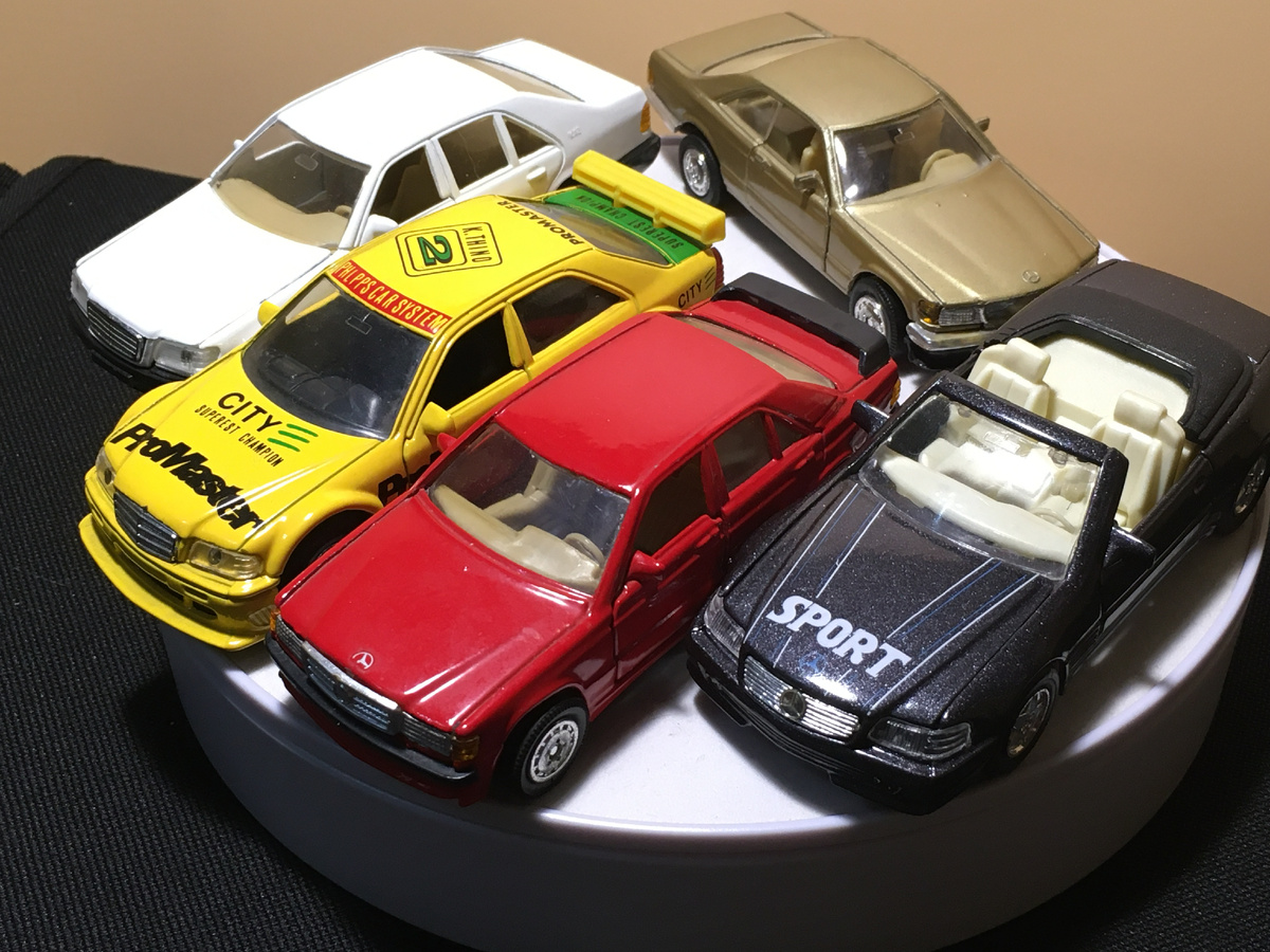 В финале статьи нас ожидает первое поколение С (Ц) - класса, 202 кузов в DTMном исполнении. Самая лучшая по качеству модель в данном обзоре. Выпускалась в середине и конце 90-х. Чаще всего в спортивных окрасах или моноцветном серебристом варианте. Лично мне попадалось 4 варианта расцветок в стиле реальных команд DTM серии (3 из них на фото). Желтая нравится больше всех остальных. Штамповка кузова, покраска и нанесенные декали высокого (для Велли) качества. Сходство с оригиналом достаточное, что бы коллекционеры обратили внимание, особенно, любители гоночных моделей. В идеальном состоянии попадается очень редко, цена при этом будет 1500-3000р. Пожалуй, мой самый любимый Мерседес от Велли, рекомендую к приобретению.