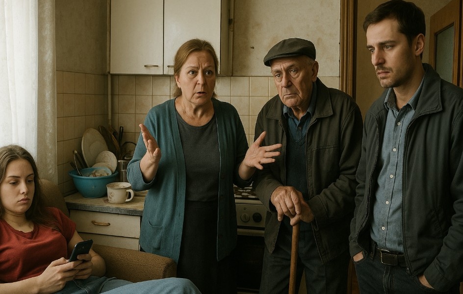В этот момент из комнаты послышалось шарканье — вошёл Василий Григорьевич, опираясь на палку. Суровое лицо, домашние тапки и привычный взгляд, которым он умел одним движением навести дисциплину в доме.
