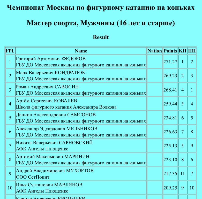 На Навка Арене подошёл к конку чемпионат Москвы. Соревнования закрывали выступления мужчин, об их произвольных программах и поговорим. 2S, 2T, 4T, 3S, 4T+2T, 3A+2A+2A, 3A. Кажется, что у Никиты травма или он совсем недавно начал восстанавливаться и только набирает форму. Сильная часть Никиты — прыжки не получаются, но он вновь и вновь заходит на них. Вращения — совсем слабенькие, дорожка шагов, к сожалению, тоже. 140.10, 225.13, седьмое место. Для полной коллекции Даниилу не хватает 1Lz. Кажется, что фигуристу не помешало бы чуточку подсушиться, и с прыжками станет лучше. Пока ошибок многовато. 151.43, 234.81, пятое место. 🥉Роман Савосин (Алексей Четверухин) 4T+3T, 4S, 4T, 3A+1Eu+3S, 3A, 3Lz, 3F+2T У Ромы яркая и зажигательная постановка под Queen. Спортсмену очень идёт, хочется танцевать во время проката фигуриста. По элементам всё исполнено чисто. Самое яркое выступление на этих соревнованиях. 180.63, 268.41. 4S+2T, 4T, 4S, 3Lo, 3A+1Eu+2S, 3A, 3F+2A. Все элементы Артём исполнил неп