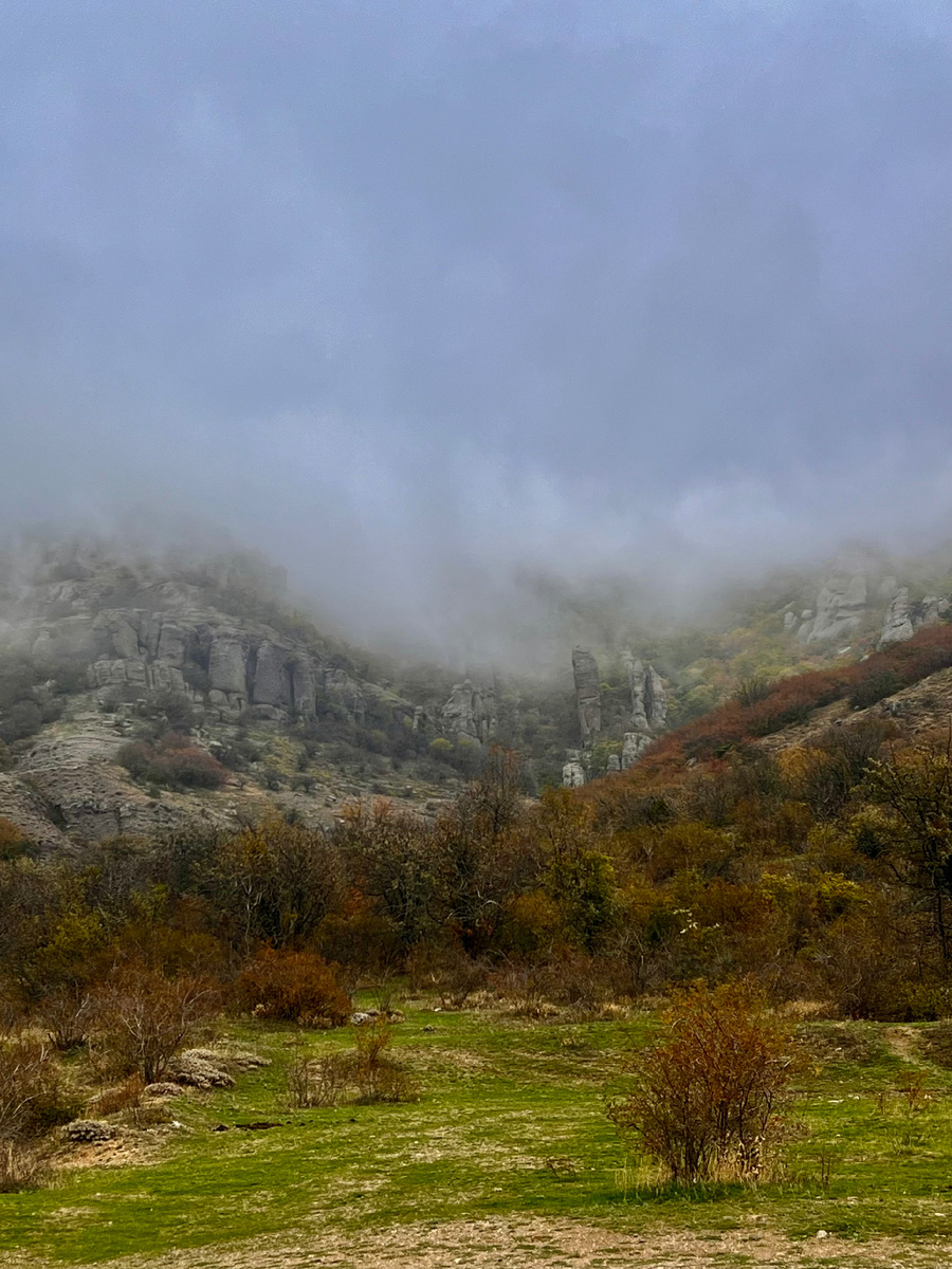 Инструкторам нельзя долго сидеть без дела, скучаем. Поэтому пока нет групп ходим в горы сами, дабы освежить впечатления, вспомнить ориентиры и ноги размять. В этот раз решили подняться на Демерджи. В который раз? Не спрашивайте, я не считаю. Это же не Эверест и даже не Эльбрус. Итак, сразу отвечу на первый вопрос, —Когда лучше всего подниматься на эту гору? Демерджи относится к горам, доступным для восхождений круглый год, и даже зимой. В мае и июне склоны зеленые, много цветов, очень красиво. Осенью стоит дождаться октября — и именно тогда лес начинает желтеть и краснеть. В начале октября красок ещё не много, пока что преобладает зелень. Выкладываю свежие фотографии, смотрите, как выглядит Демерджи в этом году. Начинаем путь из села Лучистое и любуемся Долиной Привидений. Она укутана низкой облачностью. Долина - это весь Юго-Западный склон горы. Причем довольно крутой склон. Привидения - столбы выветривания разных форм и размеров. В тумане все выглядит сказочно и таинственно. Но к