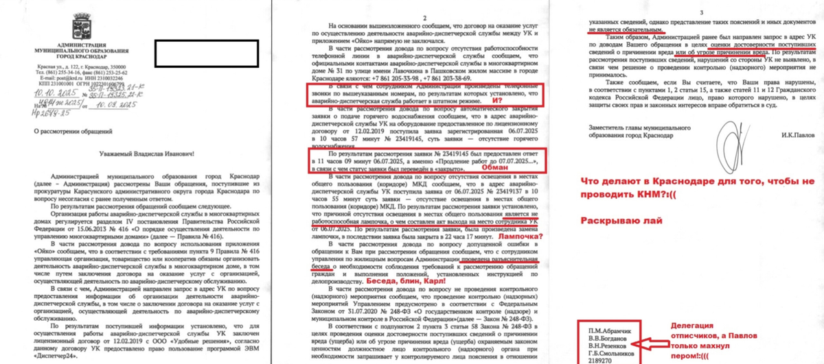 Поводом для данного заявления является полученная мною 10.10.2025 очередная отписка заместителя главы МО г. Краснодар И.К. Павлова (исх. №35-П-19323.21-К, 35-П-19325.22-К), которая является наглядным доказательством сложившейся порочной практики, когда чиновник, чьи действия обжалуются, сам себя «проверяет» и, естественно, нарушений не находит.